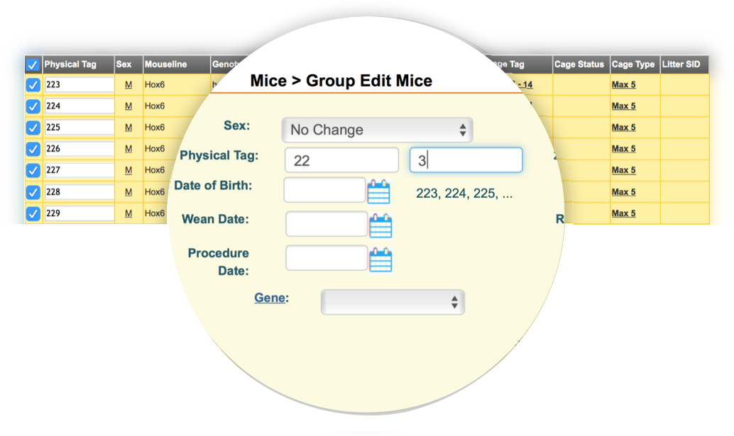 SoftMouse allows you to design experiments based on age, genotype and more. Save time by setting up recurring times for data input to track weight, injections, diet, injections, blood draws, comments etc.